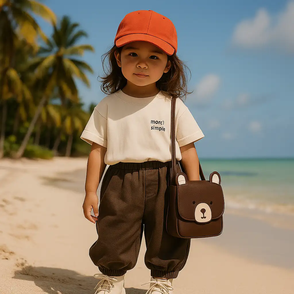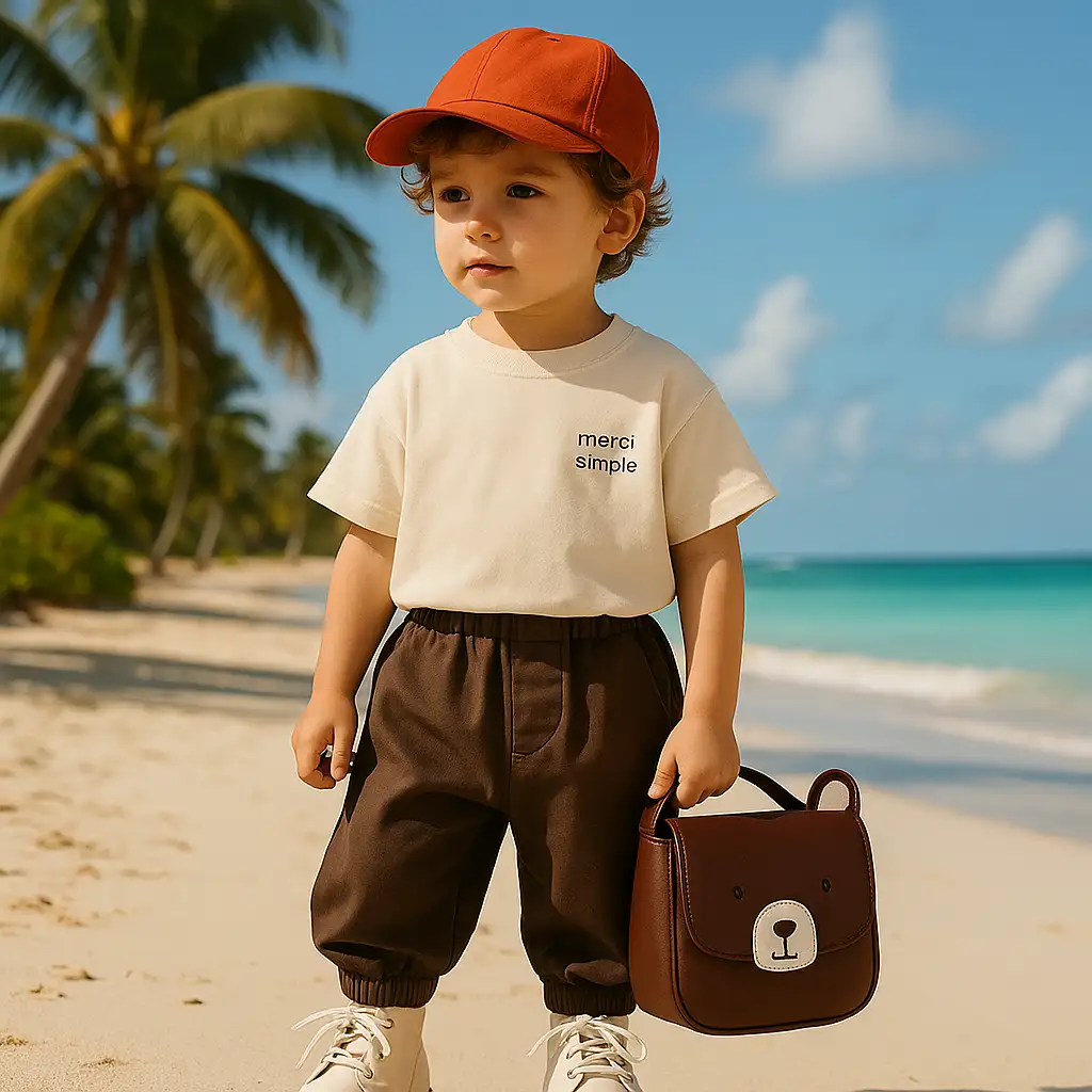 ست اسپرت تیشرت کرم و شلوار قهوه‌ ای یک انتخاب ایده‌آل برای کودکانی است که هم به راحتی اهمیت می‌ دهند و هم به استایل. این ست شامل یک تیشرت کرم با چاپ ظریف «merci simple» و یک شلوار قهوه‌ ای جذاب است که به همراه کیف خرسی و کفش سفید، ظاهری کامل و چشمگیر ایجاد می‌کند.